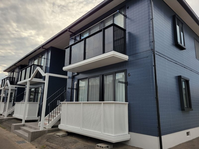 紺色の外壁は上品で落ち着いた高級感、紫外線に強く色褪せしにくいという機能性、どんな建物にも馴染みやすい汎用性、そして白や木材との相性の良さが大きなメリットです。